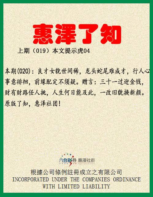 【惠泽了知】020期:本期(020):良才女貌世间稀,龙头蛇尾难成才,行人心事意徘徊,前缘配定不须疑。赠言:三十一过迎金钱,财有财路任人挑,人生何日能及此,一改旧貌换新颜。原版了知,惠泽社团! 【惠泽六肖】:牛狗羊马蛇兔 【惠泽三肖】:牛狗羊 【惠泽一肖】:牛 【惠泽特码】:06.18.21.33.12.24.13.25.14.26.04.16 【惠泽平肖】:兔兔兔 【惠泽平尾】:555 |